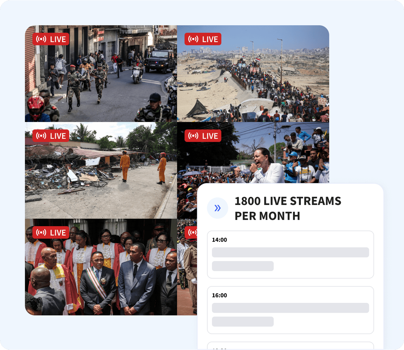 Access five original live feeds — plus AFP’s curated editorial selection — all from a web and mobile platform designed for newsrooms: simple, fast, and built for real‑time operations.