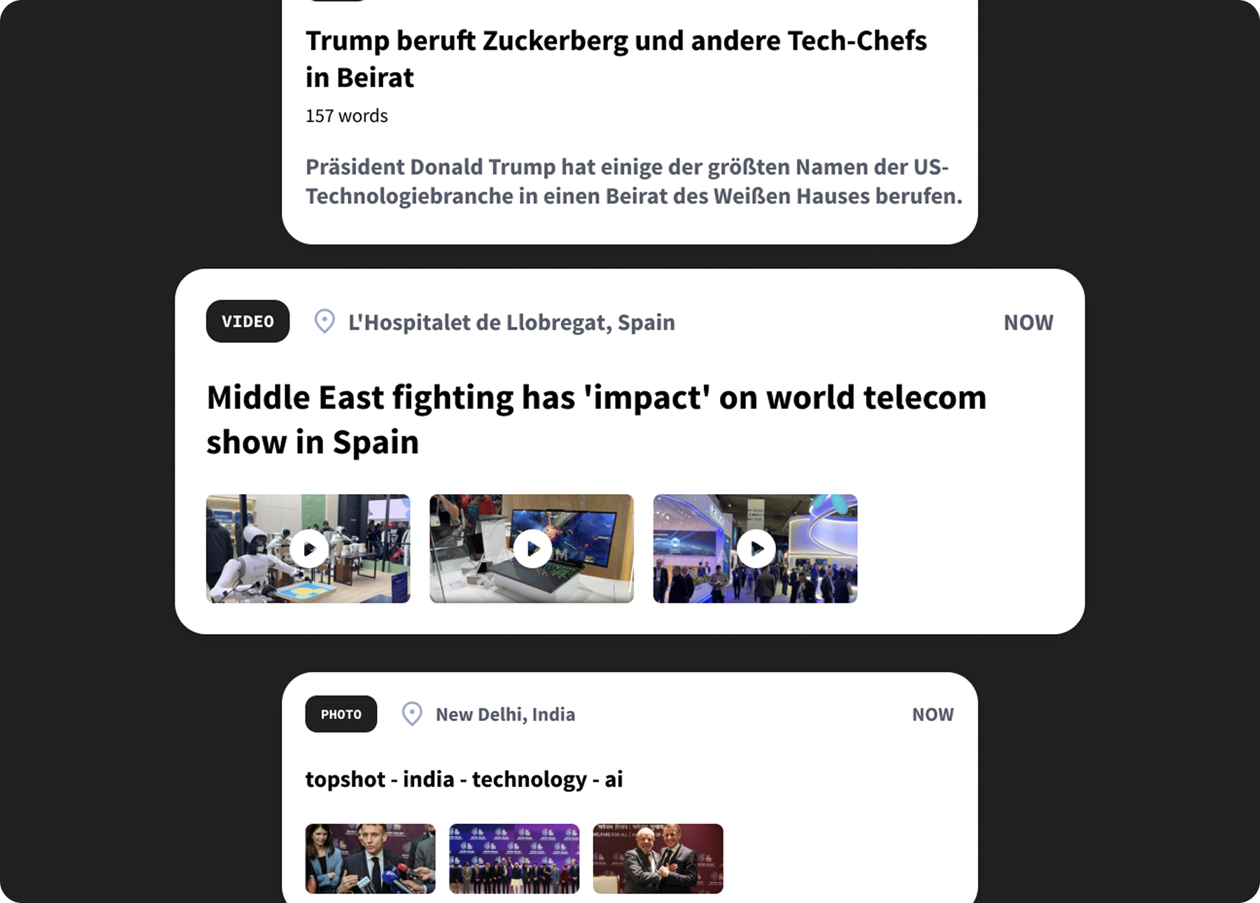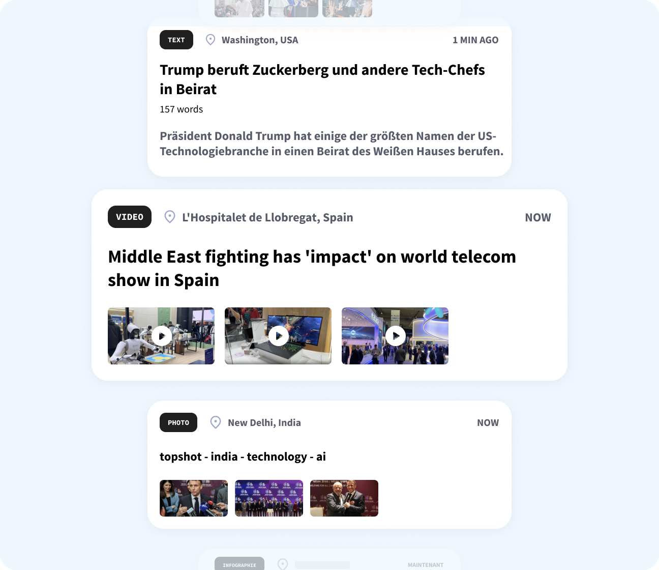 Text content in 6 languages, photo and video on AFP’s feed in one or multiple languages. |