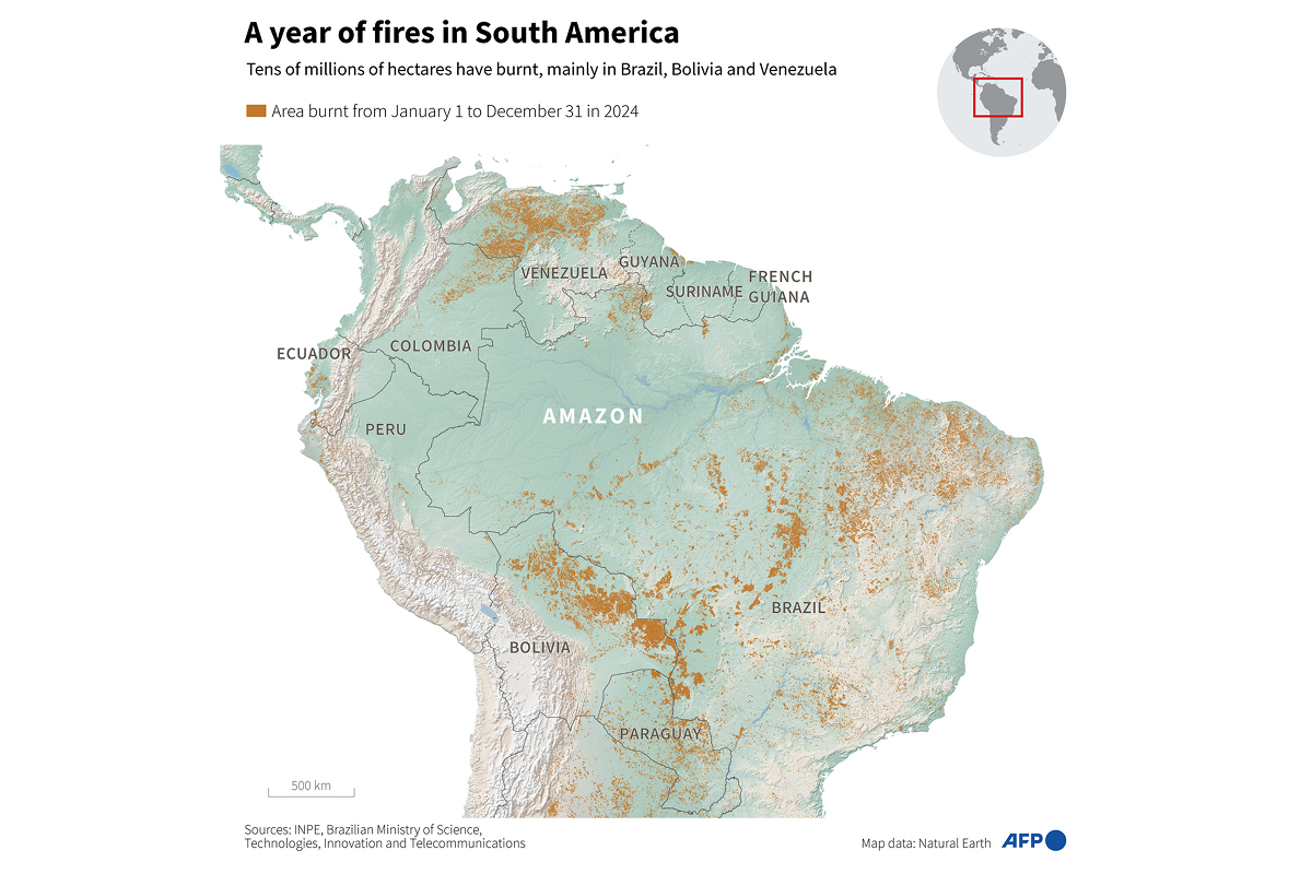 Carte montrant les zones brûlées en Amérique du Sud du 1er janvier au 31 décembre 2024. © Pierre Moutot, Paz Pizarro, Guillermo Rivas Pacheco / AFP