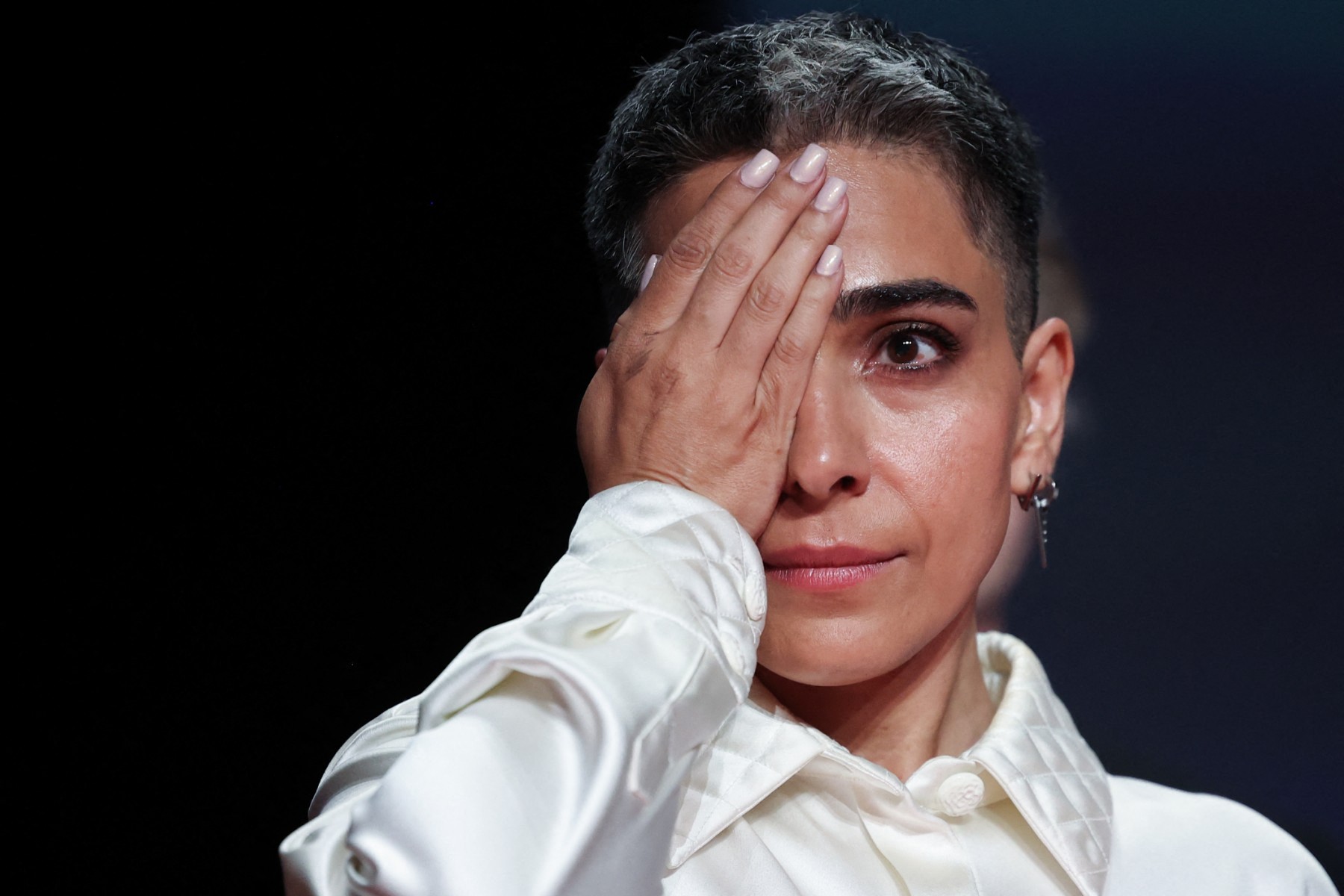 • 2e photo : L’actrice iranienne Maryam Afsharimovahed après la victoire du réalisateur, scénariste et producteur iranien Jafar Panahi, le 24 mai 2025. © Valery Hache / AFP