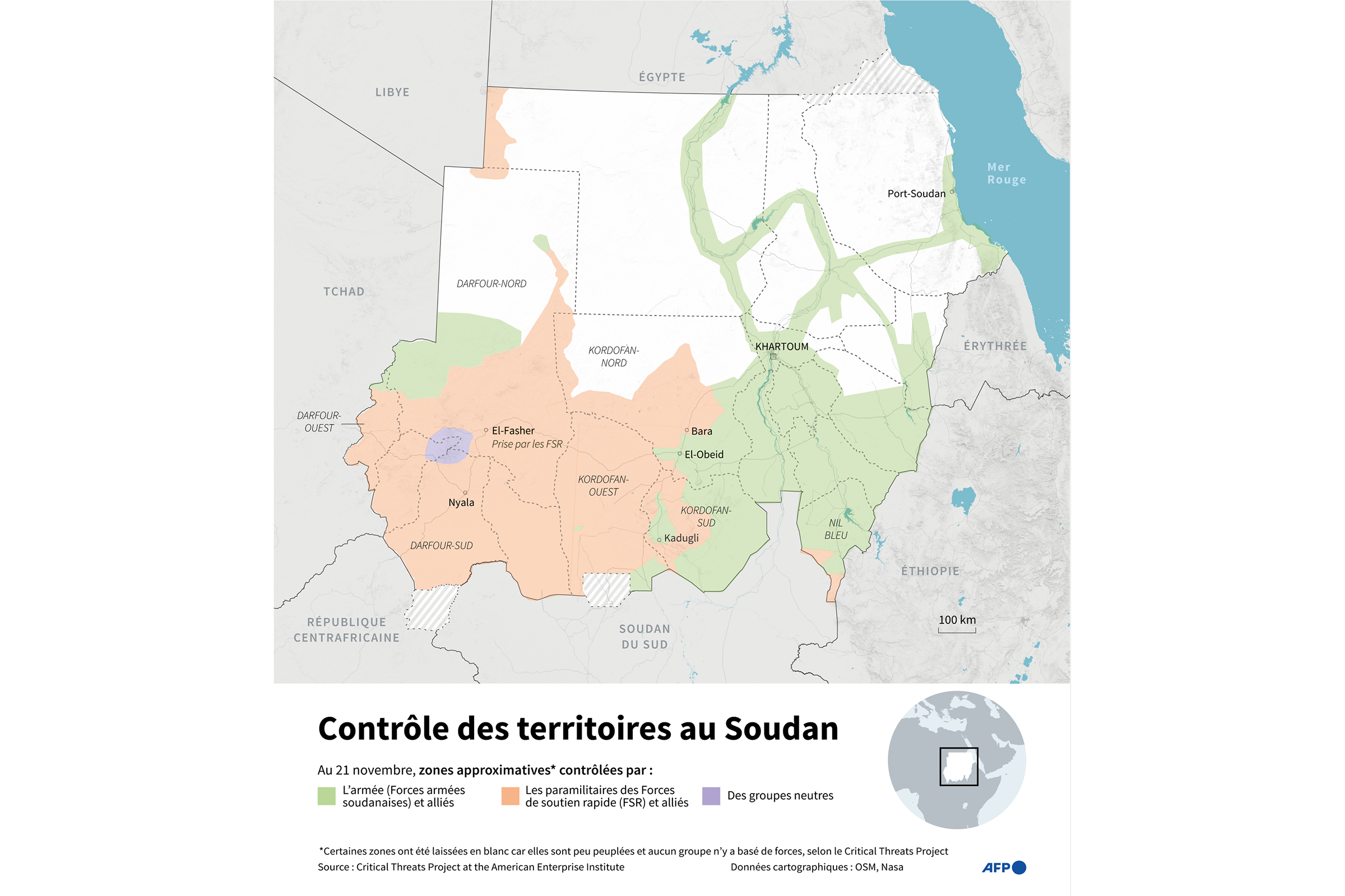 Carte du Soudan montrant les zones contrôlées par l'armée, les paramilitaires des Forces de soutien rapide (FSR) ou par des groupes neutres au 21 novembre 2025, selon les données du Critical Threats Project at the American Enterprise Institute. © Julie Pereira, Nalini Lepetit-Chella, Sabrina Blanchard / AFP